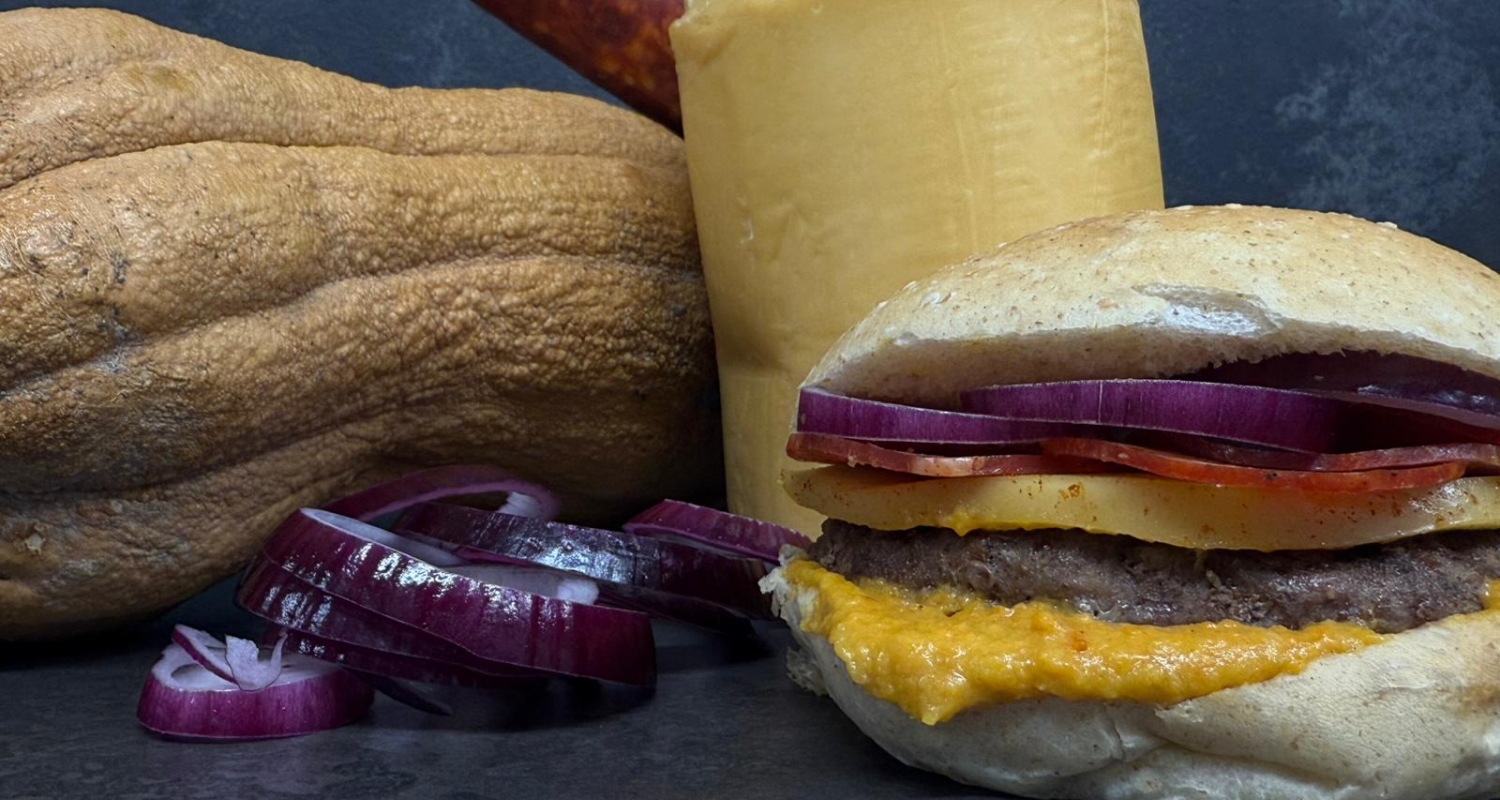 Pane Homemade, Hamburger di scottona 180gr. macelleria Punto Più, crema di zucca Mantovana, provola affumicata, salamino piccante Mangiafuoco salumificio Merlotti e cipolla di tropea.