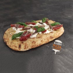 € 13,00Mozzarella fiordilatte 100% latte italiano, acciuga del Cantabrico in olio EVO, pomodorino semi-secco, burrata, foglie di basilico fresco, olio EVO (1-7 vedi allergeni*)