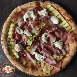 € 13,00Pane home made Buona Pizza, hamburger di scottona limousine 180gr. , uovo sodo, brie, speck croccante, maionese e salsa yogurt, con contorno di zucchine pastellate.