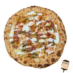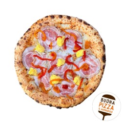 € 13,00Mozzarella fiordilatte 100% latte italiano, pancetta stufata al miele, cipolla rossa caramellata, scaglie di Grana Padano Dop, olio EVO. (1-7 vedi allergeni*)