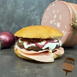 € 12,00Pane home made Buona Pizza, hamburger di scottona limousine 180gr. , Mortadella Bologna IGP con pistacchi Simonini 1927, cipolle rosse caramellate, stracciatella, olio EVO con contorno di patate Dippers.